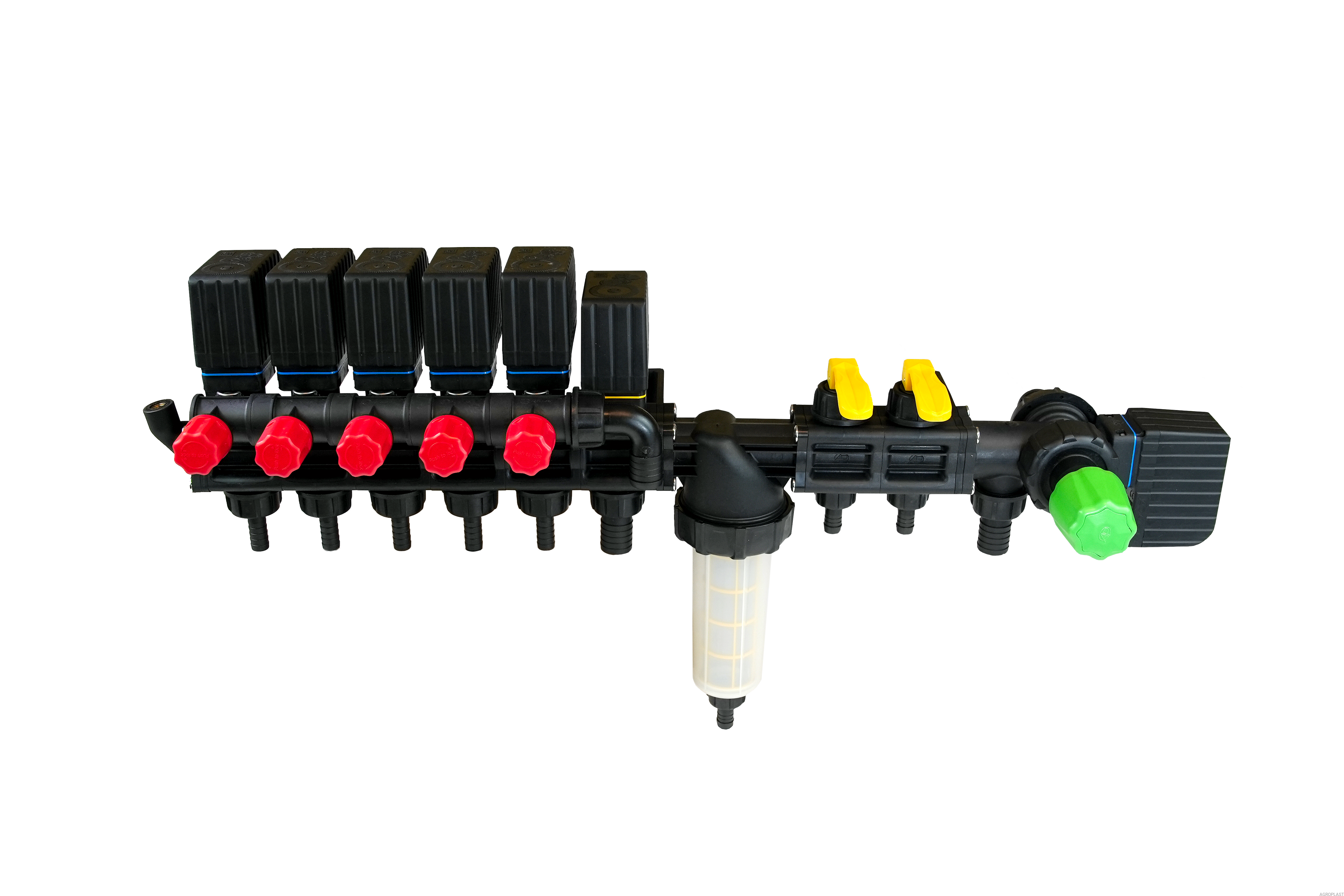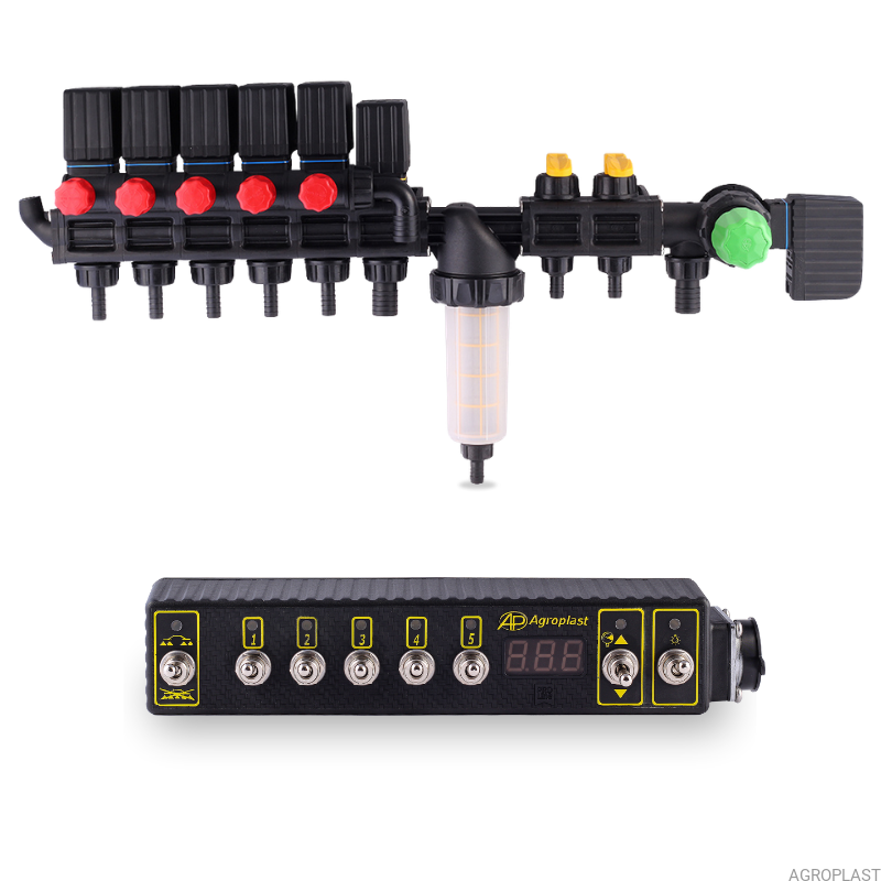 Komplet zawiera Rozdzielacz sekcyjny HD z elektrozaworami oraz sterownik 5-sekcyjny.